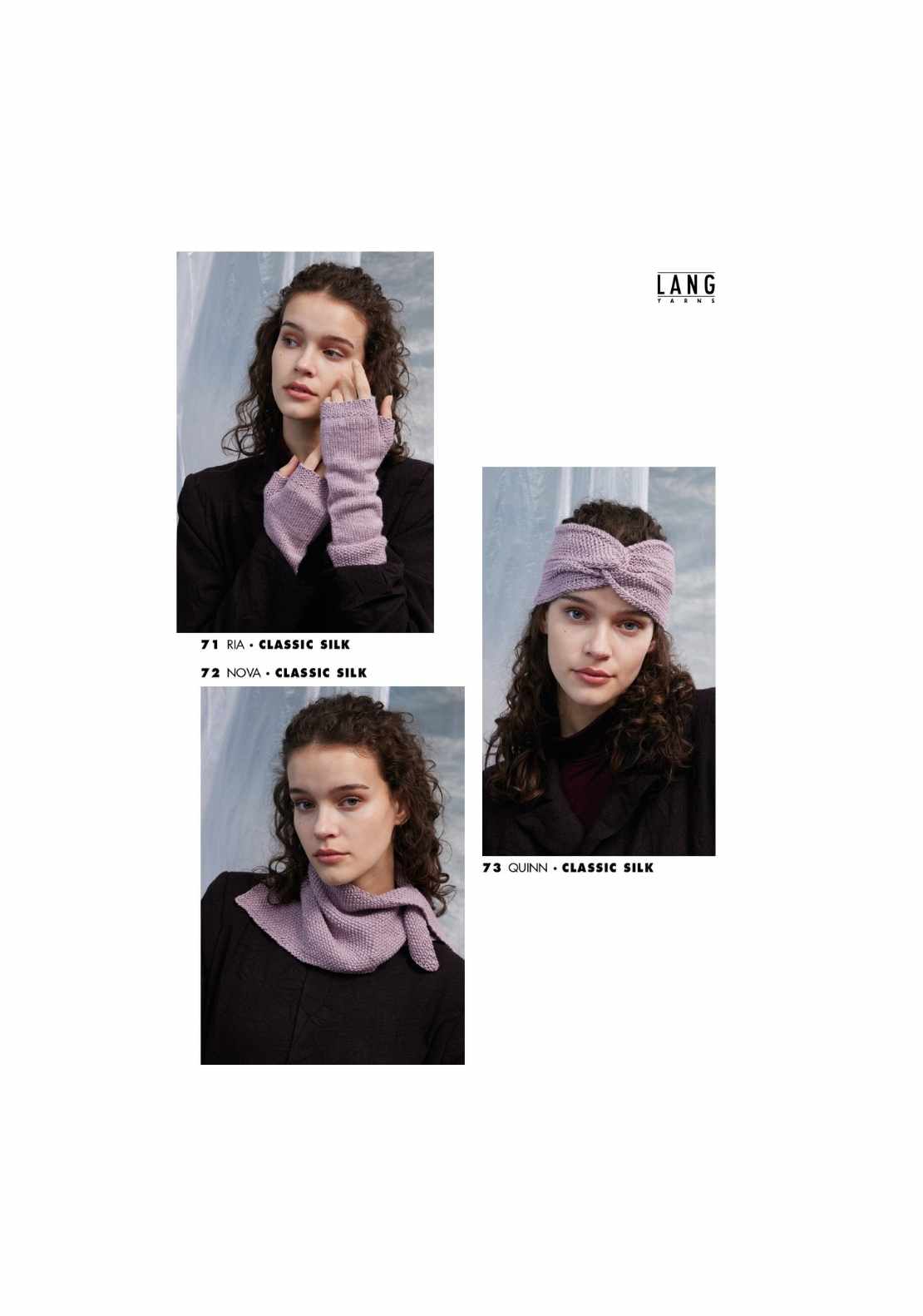 This is Lang's new Fall/Winter Collection for 2025-26. There are 87 new patterns for women and men, with coats, jackets, pullovers, cardigans, pullover vests, shawls, scarves and other accessories. The photos below are for yarns we stock, including Cashmere Dreams, Classic Silk, Nomad, Suri Alpaca, Regina, and Malou Light.